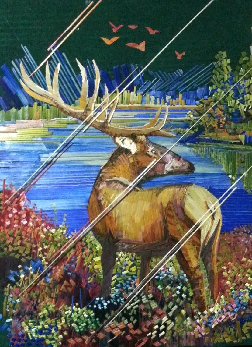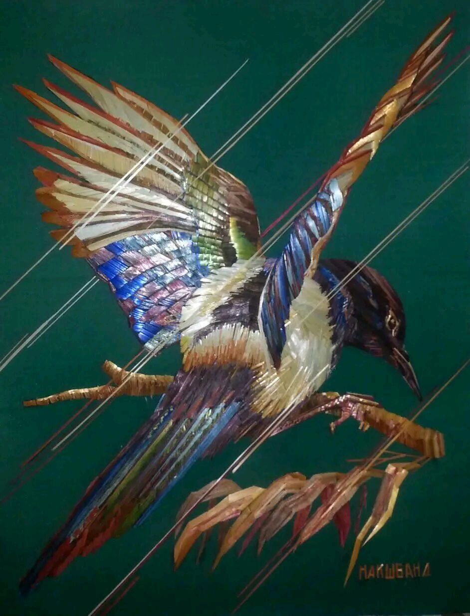 С пшеничной соломой и камышом работают и в других странах, но у них более упрощенная, аппликационная система работы. Аппликация обычно выкладывается по отдельности на бумагу и клеится, а потом из нее вырезают нужный рисунок или деталь к нему и все выкладывается на основной эскиз – на фанеру, например.
