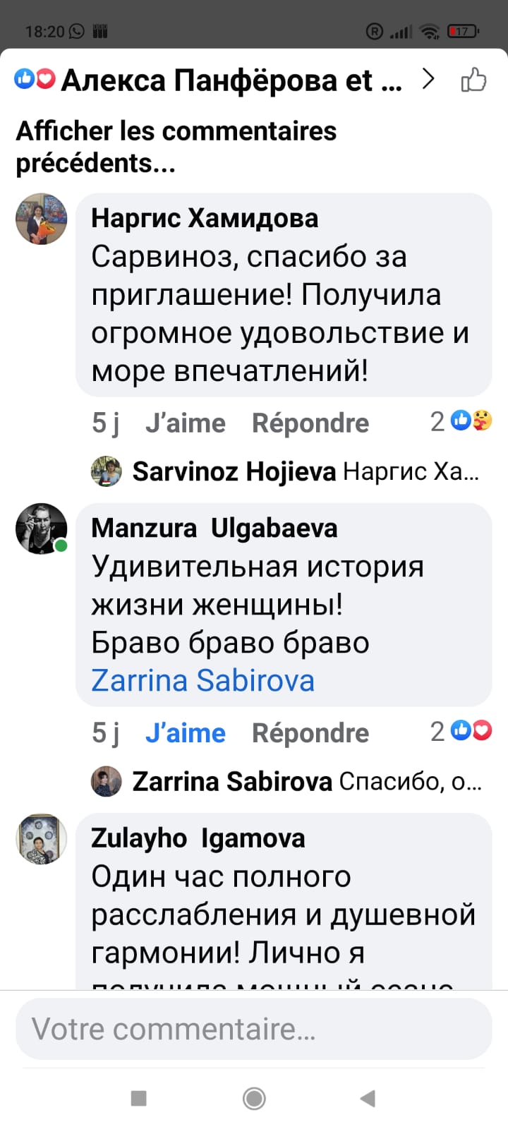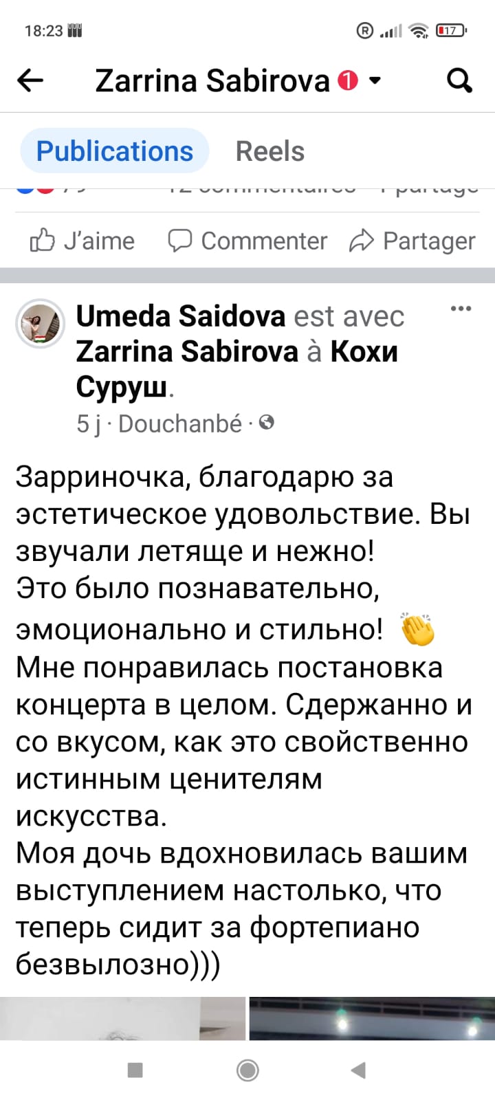 «Каждую неделю я занимаюсь с 35 учениками. Вообще за 15 лет моего преподавания в Париже вы найдете много детей, которые скажут, что их первая учительница музыки из Таджикистана. Каждый из моих учеников знает теперь, где находится Таджикистан и откуда я приехала. Знает это место по карте, которая висит у нас и на которой Таджикистан помечен флажком», — с гордостью говорит Заррина.